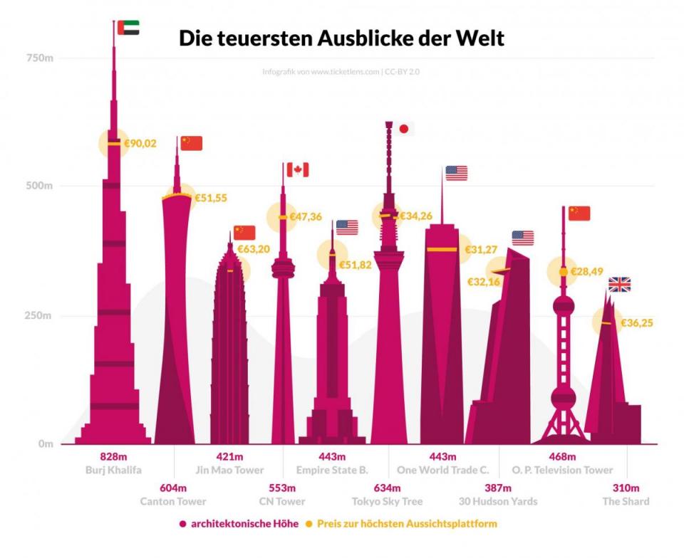 In fast jeder größeren Stadt der Welt finden sich Gebäude mit Panoramablick. Welche Stadt mit welcher Aussichtsplattform den teuersten Ausblick erlaubt und was sich Besucher das Panorama einer Landschaft je Höhenmeter kosten lassen, hat das Internetportal TicketLens untersucht. Dort haben die Macher die Aussichtsplattformen der 75 höchsten Gebäude der Welt und deren Eintrittspreise verglichen.