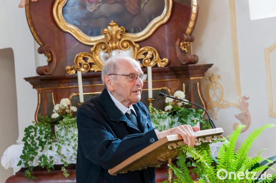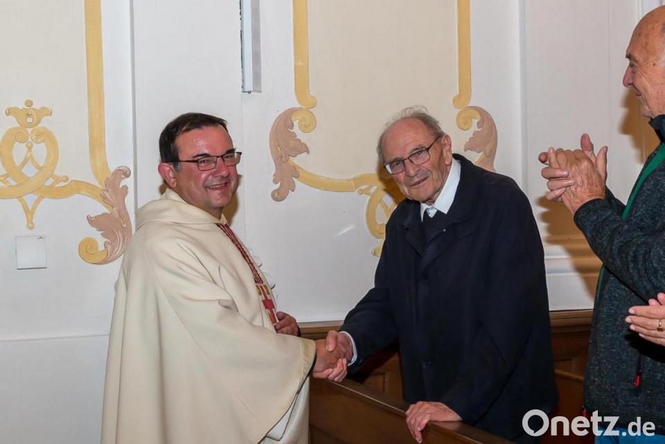 Eine musikalische Überraschung für Pater Reinhold Schmitt gab es zum Abschluss. Die Musiker und Pilger gratulierten dem beliebten Geistlichen, der seit 14 Jahren auf dem Kreuzberg wohnt, nachträglich zu seinem 90. Geburtstag mit einem Marsch. Als Geschenk überreichte Bernd Schwamberger eine Spende der Wallfahrer für das Missionsprojekt im Senegal, das von Pater Schmitt unterstützt wird.