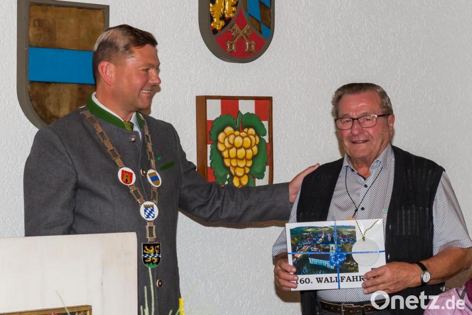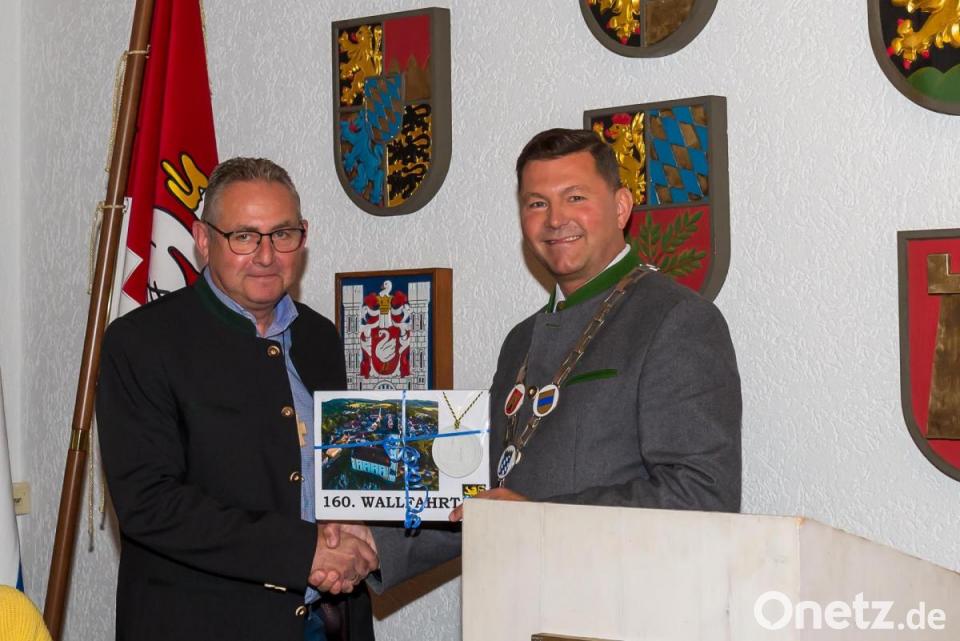 Am Abend stand ein Empfang im Pleysteiner Rathaus an. Bürgermeister Rainer Rewitzer begrüßte die Thanhausener und betonte, dass er als "alter Wallfahrer" weiß, dass eine so weite Strecke bei weitem nichts Alltägliches ist. Zur Jubiläumswallfahrt überreichte er den Pilgerführern und Organisatoren stellvertretend für alle Teilnehmer eine Luftaufnahme und den Pleystein-Taler.