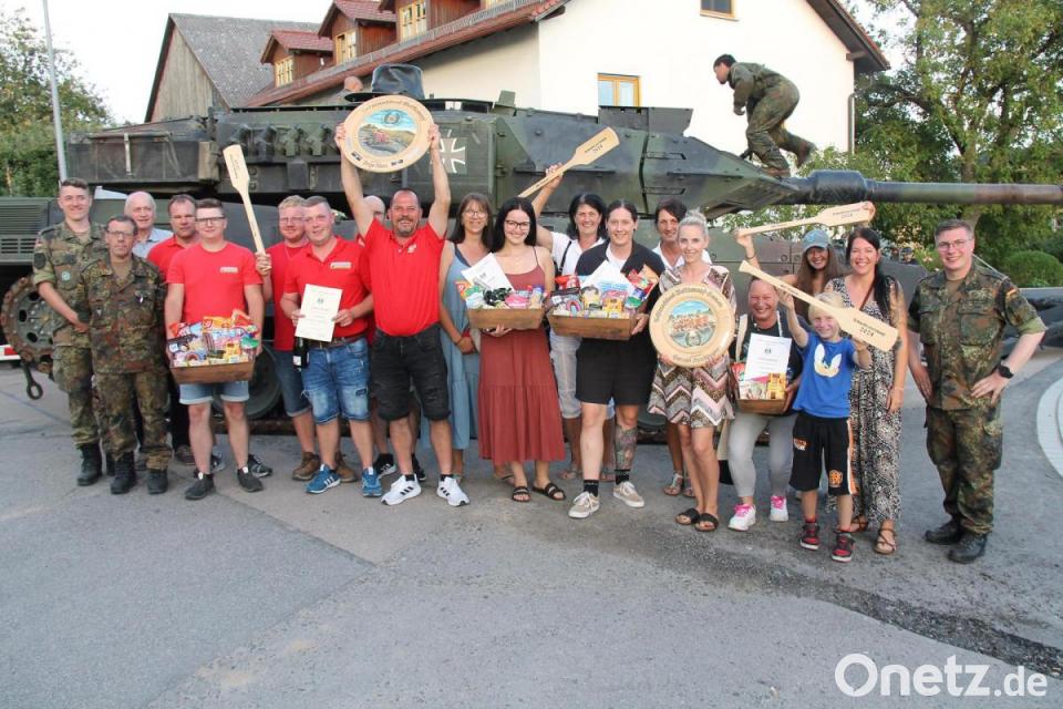 Bürgermeister Walter Schauer hob den guten Kontakt zu den bisherigen Bundeswehrpateneinheiten aus den Standorten Neunburg und Pfreimd hervor. Auf 50 Jahre Patenschaft könne nicht jede Gemeinde zurückblicken. Der stets Kontakt startete 1973 mit der 2. Kompanie des Panzerjägerbataillon 114 in Neunburg. Die 4. Batterie des Panzerartilleriebataillons 115 und die 5. Kompanie des Panzerbataillons 104 folgten. Seit 2022 besteht eine neue Patenverbindung mit dem Stabszug des PzBtl 104 aus Pfreimd. Seinen Dank sprach er Generalmajor Norbert Wagner aus. Schauer bedankte sich besonders bei den Soldaten, die mit ihrem Dienst der "Demokratie dienen und das Recht und Freiheit verteidigen". Seinen Dank zollte er den beiden Reservistenkameradschaften aus Thanstein und Kulz. Der SRK gratulierte er zum 135-jährigen Bestehen und beglückwünschte die Mitglieder zur gelungen Sanierung des Vereinsheims. Schirmherr Hauptmann Fabian Wagner ließ den Litauen-Einsatz des Verbandes kurz Revue passieren. Er lud die Thansteiner zum Rückkehrerappell am Samstag, 14. September, in die Oberpfalz-Kaserne nach Pfreimd ein. Geschenkkörbe und Gastpräsente überreichte Vorstand Ulrich Knoch an die Gäste und Sieger.