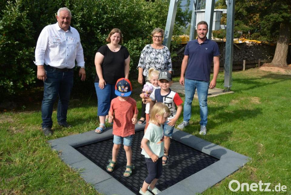 Gemeinderat Alexander Fachtan dankte seinen Mitbewohnern bei einem Ortstermin für den Einsatz zum Wohle der Kinder. Hildegard Betzl freute sich, dass in Themenreuth das erste barrierefreie Bodentrampolin auf einem öffentlichen Spielplatz im Landkreis errichtet wurde.