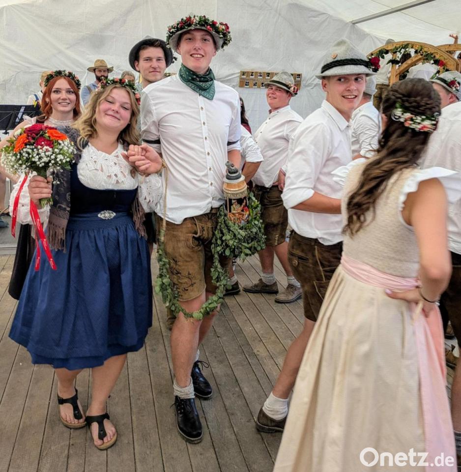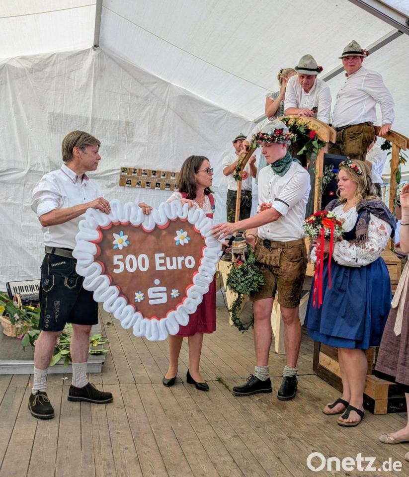 Der Höhepunkt des Tages war das Austanzen des Baumes. Die Kirwapaare, musikalisch begleitet von den „Höidlbrumma“, begeisterten das Publikum mit ihren selbst einstudierten Tänzen und ernteten dafür viel Applaus. Zwischen den Tänzen wurden in humorvollen „Gstanzln“ die amüsantesten Ereignisse des vergangenen Jahres besungen. Mit Spannung wurde die Kür des neuen Oberkirwapaares erwartet. Als die Musik verstummte, stand fest: Leonie Wächter und Korbinian Götz übernehmen ab sofort diese ehrenvolle Rolle. Als erste Amtshandlung nahmen sie eine Spende der Sparkasse entgegen, die im Rahmen ihrer „Kirwa-Reise“ zum 200-jährigen Jubiläum vergeben wurde – ein Gewinn aus dem Kirwa-Warm-Up im April. Auch der Heimatverein Theuern überreichte eine Spende an TSV-Jugendleiter und Kirwabursch Philipp Schrott.
