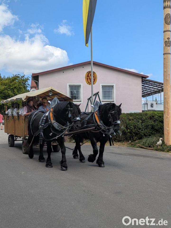 Bei strahlendem Wetter feierten die 15 Theuerner Kirwapaare ihr Fest rund um das Sportgelände des TSV Theuern. Den Auftakt bildete am Samstagnachmittag das Aufstellen des Kirwabaums. Am Abend sorgten die „Stockerholzer Buam“ im vergrößerten und neu platzierten Festzelt für ausgelassene Stimmung. Der Sonntag begann mit einem feierlichen Gottesdienst. Nach dem gemeinsamen Mittagessen folgte eine weitere Neuerung: Zum Einholen der Moidln fuhren die Kirwaleute in einem von Daniel Dummet gesteuerten Gespann, gezogen durch zwei imposante Percherons – französische Kaltblutpferde von Stefan Hofmann aus Ehringsfeld – durch das Dorf zurück zum Festplatz.