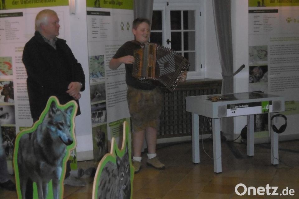 Die Vernissage vermittelte Wissen über die "großen Vier". Mit dabei waren, von der 9. Klasse der Mittelschule Ensdorf mit Schulleiterin Helga Gradl, Bastian Hummel, Paul Haas, Tim Schambeck, Sebastian Rost und Michael Drexler mit einem Sketch. Aus Beutetieren wurden dabei durch versetzte Buchstaben Beutejäger. Für die musikalische Untermalung sorgte Michael Drexler (6. Klasse) auf dem Akkordeon. Den Eröffnungs-Vortrag hielt Markus Martini, Wolfsbeauftragter für die Oberpfalz. Von den "großen Vier" war zumindest einer bei der Vernissage zugegen - der Mensch.