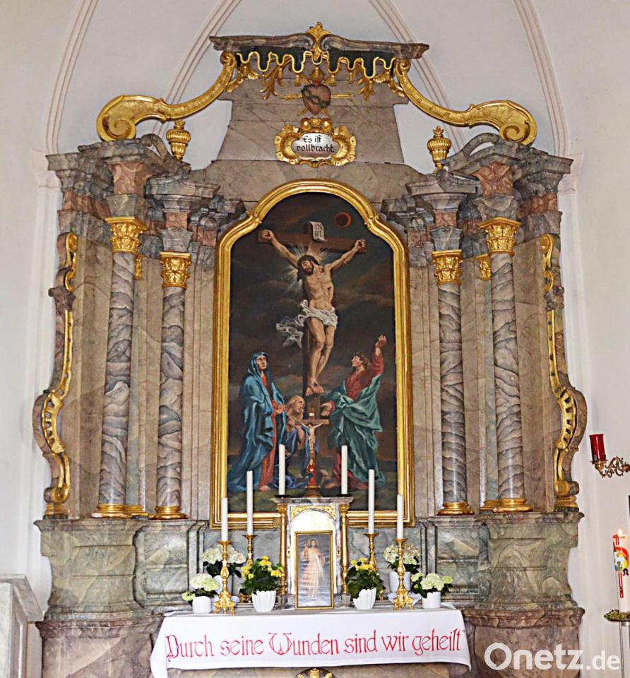 Betritt man die Kapelle, trifft der Blick unwillkürlich auf das Altarbild. Der Bamberger Künstler E. Stengele hat es im Jahre 1985 geschaffen, nachdem das ursprüngliche Altarbild bei einem sehr frevelhaften Diebstahl entwendet worden war. Der sterbende Heiland mit den weit ausgebreiteten durchbohrten Händen, sein geöffnetes ausgeblutetes Herz, den Kopf nach rechts geneigt und unter dem Kreuz drei Personen, die ihm auch in der Stunde des Todes die Treue gehalten haben: die Gottesmutter Maria, der Lieblingsjünger der heiligen Apostel und Evangelist Johannes sowie die Büßerin Maria von Magdala, die dem Herrn zu Füßen liegt. So klein war das Häuflein der Jünger geworden, dass Jesus in seiner Todesstunde, in seiner scheinbaren Gottverlassenheit in der Liebe verbunden waren. Der Künstler hat damit eindrucksvoll zum Ausdruck gebracht, in welcher Hingabe und Geduld sich der Herr noch am Kreuz bis zum letzten Atemzug sich in der Liebe verzehrt hat.