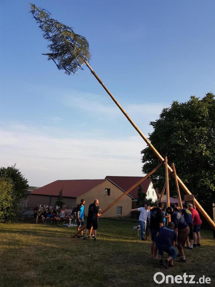 Die Thurndorfer Blasmusik versteht sich nicht nur auf geistliche Klänge zur Begleitung von Prozessionen und Kirchzügen. Am Samstag wurden die Besucher des vorangegangenen Gottesdienstes zu Ehren des Apostels Jakobus von der Pfarrkirche musikalisch zum Feuerwehrhaus geführt. Dort wartete bereits das Kirwasymbol. Aktive der Feuerwehr Thurndorf und die Katholischen Landjugend hievten den Baum in die Senkrechte. Die Blaskapelle "feuerte" die Männer mit passender Musik an. Für Stärkung war gesorgt.