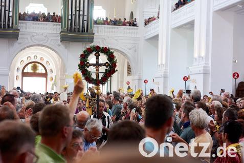 Beim Eintreffen in Altötting werden die Fußwallfahrer auch stets von einer großen Anzahl an Freunden und Bekannten erwartet. Begleitet vom Glockengeläut der Stiftskirche St. Philipp und Jakob zieht der nicht enden wollende Zug vorbei am Gnadenbild der Gottesmutter von Altötting zum Gottesdienst in die St.-Anna-Basilika.