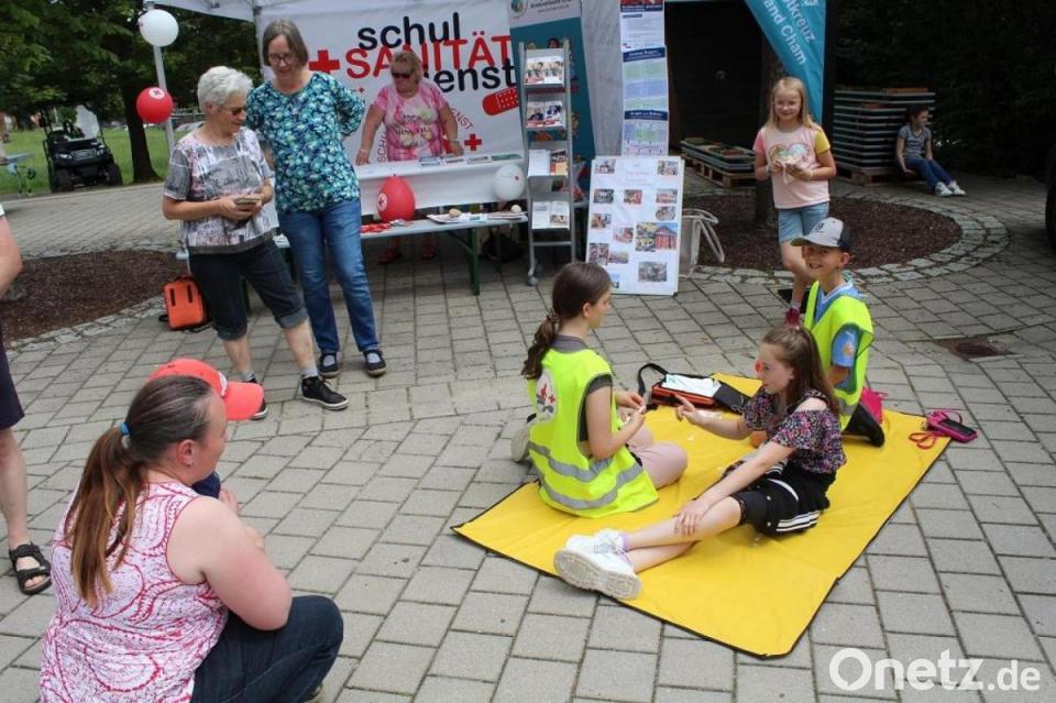 Bei der Helfer-vor-Ort Gruppe gab es die Gelegenheit, die Herzdruckmassage und den Einsatz des Defi zu trainieren. Gleich daneben führten die Schulsanitäter der vierten Klasse einige Fallbeispiele vor.