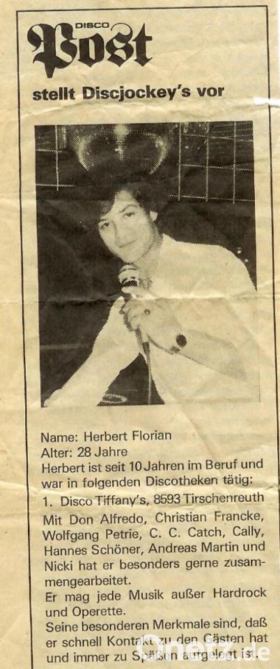 Der 61-Jährige war bis 1992 laut eigenen Aussagen der Haupt-DJ im "Tiffany". "Ich habe fast an jedem Tag aufgelegt", erinnert er sich. Der gebürtige Waldmünchener kam in den 1970er Jahren ins Stiftland. Damals hatte er Josef "Peppe" Linsmeier (ehemaliger "Tiffany"-Betreiber) kennengelernt. "Ich habe meine Lehre abgebrochen und bin nach Tirschenreuth gezogen. Dort habe ich 15 Jahre gelebt und als DJ gearbeitet." Einmal schaffte es DJ Flori sogar in das Magazin "Disco Post" als DJ des Monats. Darin steht als besonders Merkmal, dass "er schnell Kontakt zu den Gästen hat und immer zu Späßen aufgelegt ist". Er möge jede Musik, außer Hardrock und Operetten.
