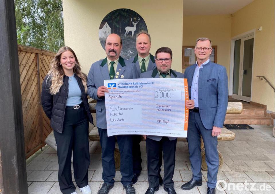 Über eine Geldspritze in Höhe von 2000 Euro freut sich der Schützenverein „Hubertus“ Wondreb. Zustande kam der Betrag durch eine Crowdfunding-Aktion und mit Unterstützung des Gewinnsparvereins Bayern, wie aus einer Mitteilung der Volksbank Raiffeisenbank Nordoberpfalz hervorgeht. Den Scheck überreichten Geschäftsstellenleiter Helmut Wolfrum und Kundenberaterin Lena Rath von der Tirschenreuther VR-Bank-Filiale an Schützenmeister Helmut Forster, Zweiten Schützenmeister Bernhard Härtl und Kassier Alwin Köstler.