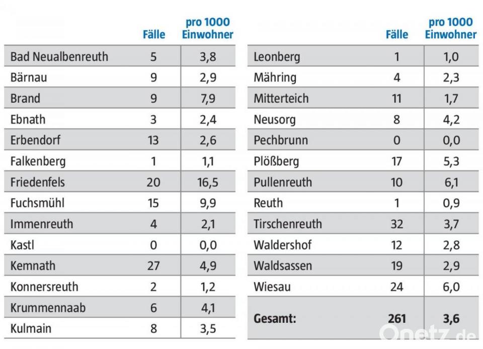 Die meisten Fälle wurden in den vergangenen sieben Tagen in Tirschenreuth (32), Kemnath (27) und Wiesau (24) verzeichnet. Hochgerechnet auf die Gemeindegröße hatten Friedenfels, Fuchsmühl und Brand die meisten Fälle. Besonders erwähnenswert: Keinen einzige Neuinfektion innerhalb einer Woche gab es in Kastl und Pechbrunn.