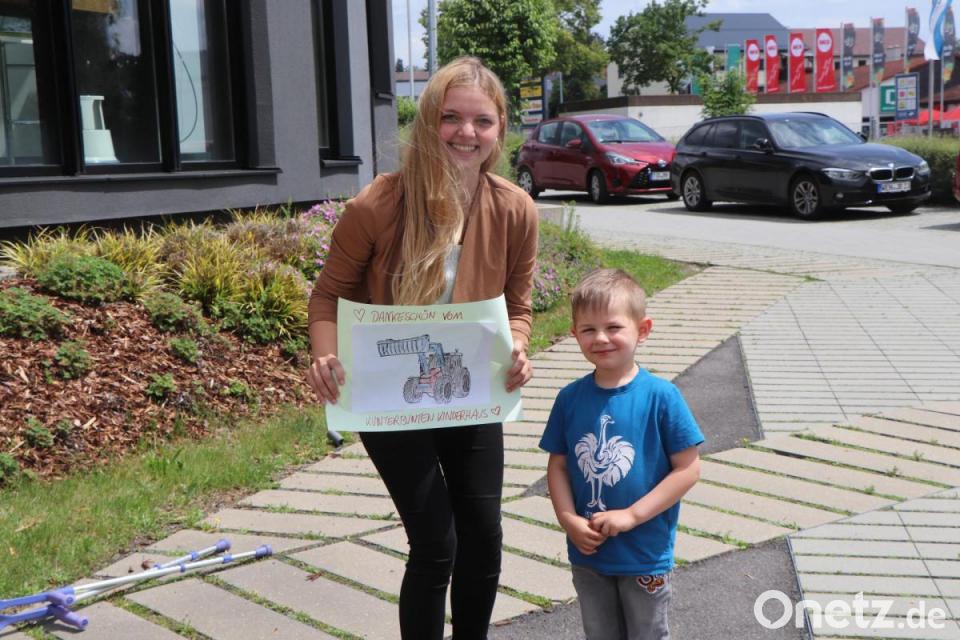 Insgesamt werden im Geschäftsgebiet der Volksbank Raiffeisenbank Nordoberpfalz 72 dieser Tret-Traktoren gespendet. „Knapp 150 Kartons mussten dafür eingelagert werden“, sagt Wolfrum. Die beiden Mitarbeiter Corinna Gleißner und Christian Seidl bauten die acht Traktoren, die am Mittwoch an die vier Kindergärten gingen, zusammen. Und Gregor, der Bulldog-Profi, hat die Arbeit für gut befunden und kann sich kaum vom neuen Spielgerät trennen. Als Dankeschön für das Geschenk überreicht er mit Silvia Markowski ein selbst ausgemaltes Traktor-Bild an Bankmitarbeiterin Corinna Gleißner.