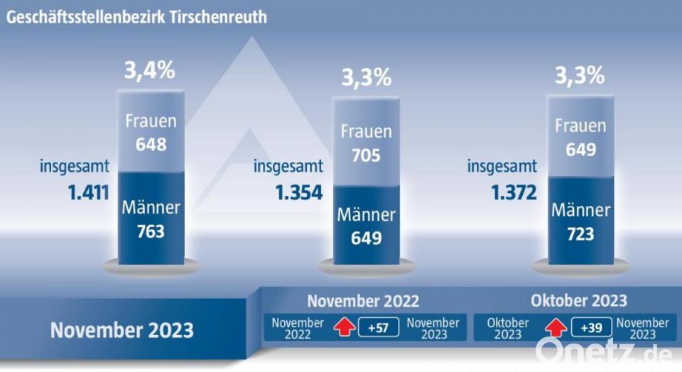 Thomas Franz, Leiter der Geschäftsstelle Tirschenreuth, sagt dazu: "Da die Witterungsverhältnisse die Bautätigkeit und andere wetterabhängige Branchen bisher wenig beeinträchtigt haben, kann der Arbeitsmarkt gute Ergebnisse vorweisen. 763 Männer und 648 Frauen waren im Landkreis arbeitslos gemeldet, ein Anstieg zum Vormonat um 39 Personen und ein Anstieg um 57 erwerbslose Personen im Vergleich zum Vorjahr." Die Zahl an ausländischen Arbeitslosen stieg im Vergleich zum Vormonat um 3,3 Prozentpunkte auf 432 Personen. Im November beendeten 309 Personen ihre Arbeitslosigkeit. Gleichzeitig meldeten sich 355 Personen bei der Arbeitsagentur oder im Jobcenter neu oder erneut arbeitslos.