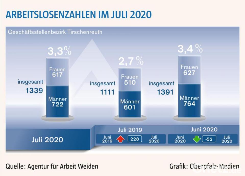 Im Juli waren 1339 Männer und Frauen von Arbeitslosigkeit betroffen. Im Vergleich zu den Vorjahreswerten waren demnach 228 mehr arbeitslos gemeldet, ein Zuwachs um 20,5 Prozent. Im Landkreis waren im Juli 722 Männer und 617 Frauen arbeitslos gemeldet. Das Jobcenter war hierbei für 611 arbeitslose hilfebedürftige Menschen erster Ansprechpartner. 728 Personen wurden von der Agentur für Arbeit betreut, 179 mehr als vor einem Jahr.