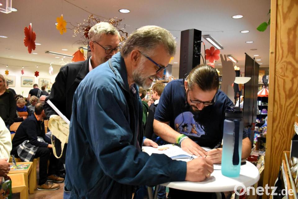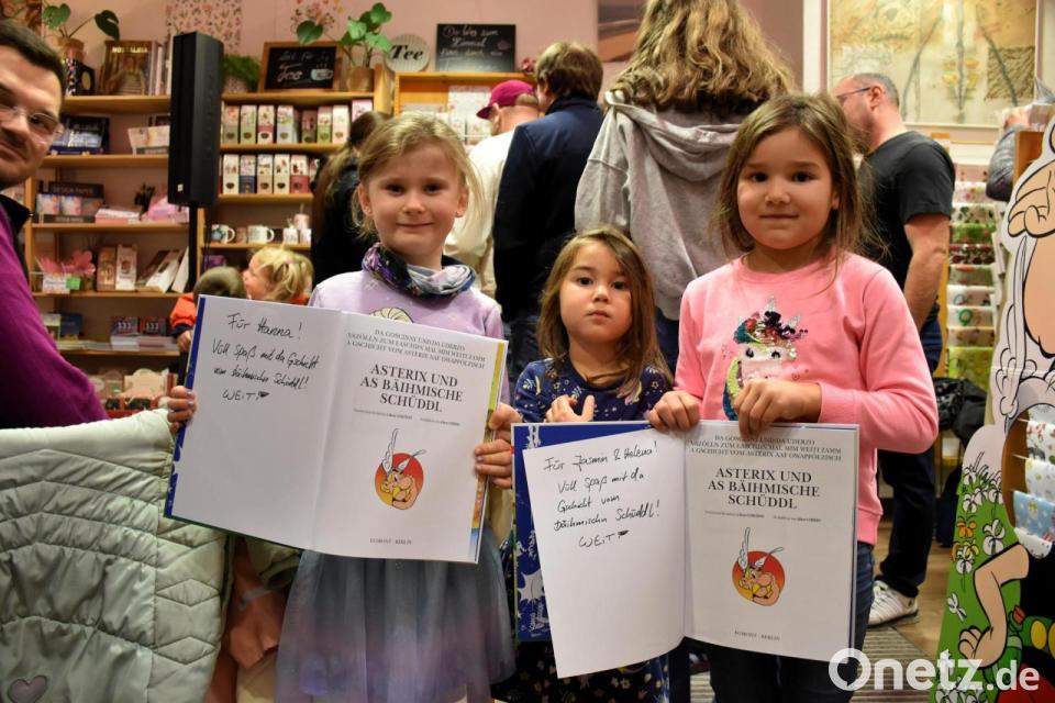 „Ganze Schulen müssen Asterix lesen“, erzählt Teicher. Und sie erzählt von der Oma aus dem Seniorenheim. „Die hat gesagt, sie lese das seit sie ein Kind war.“ Hanna, Jasmin und Helene zeigen stolz ihre Autogramme, die Witt bereits vor der Lesung hergab. Lesen können die Mädchen nicht. „Da muss der Opa herhalten“, lacht die Mama. Wolfgang Kohl von der Druckerei nebenan ist ebenfalls Fan von Asterix: „Das ist eine Herzensangelegenheit. Asterix hat meine Kindheit geprägt.“