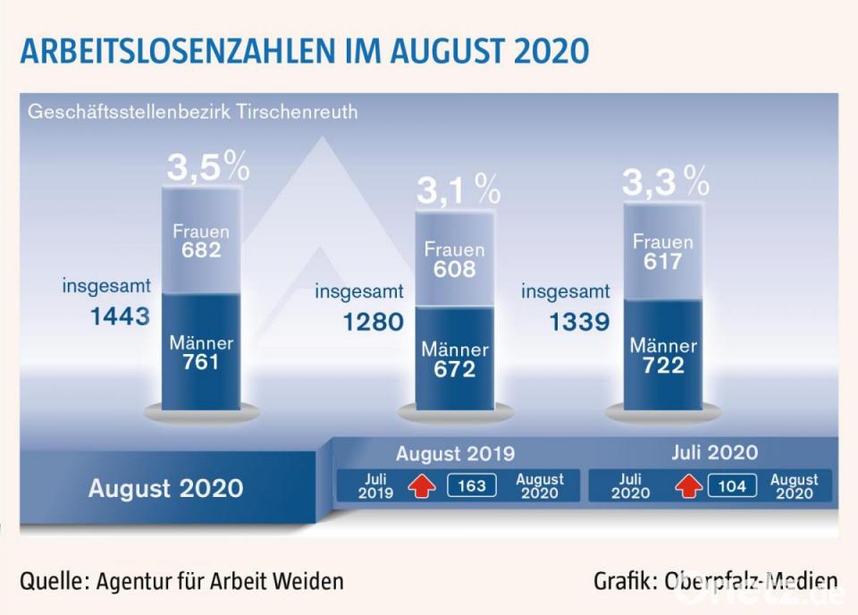 Saisonbedingt steigt die Arbeitslosenquote in den vergangenen vier Wochen auf 3,5 Prozent. 1.443 Männer und Frauen waren im August bei der Agentur für Arbeit Tirschenreuth arbeitslos gemeldet, 104 mehr als im Juli. Laut Arbeitsagentur beendeten zahlreiche Jugendliche ihre Berufs- oder Schulausbildung und waren im August auf Arbeitssuche.