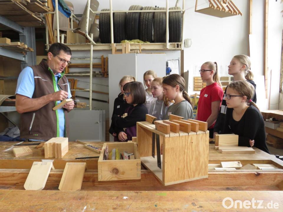 In dieser Woche sind es 17 Jungen und Mädchen aus der siebten Klasse der Mittelschule Ebnath, die in den Kolping-Werkstätten sägen, schrauben, feilen, rechnen und in Pflegeeinrichtungen mithelfen dürfen. In der Schreinerei erklärt Schreinermeister Anton Leipold den Mädchen, wie ein Holzklotz nach Maß ausgesägt wird. Die Mädels sind sehr aufmerksam, was den erwachsenen Besuchern gefällt. Von Vorteil sei, dass Mädchen Männerberufe kennenlernen und die Jungen Soziales wie Pflege, stellt Margot Salfetter heraus.