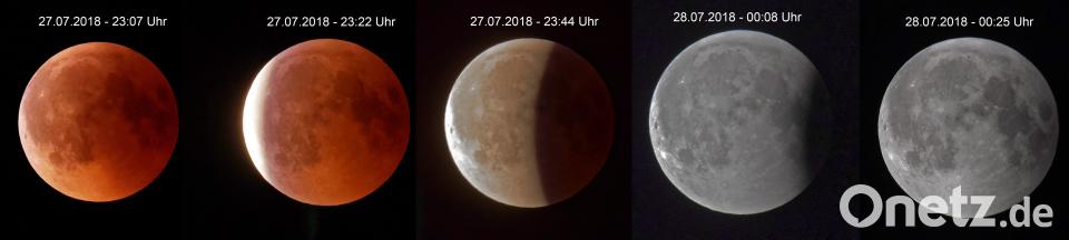 Das große Ereignis am Freitag beginnt eher unspektakulär. Jeder wartet gespannt auf einen intensiv leuchtenden "Blutmond", der endlich am Horizont auftaucht. Als es schließlich so weit ist, kommt der Erdtrabant aber ziemlich blass daher. Bevor der Mond aufgeht, lösen sich noch zwei Gewitter vor der großen Bühne auf und trüben den Himmel ein. Je höher der Mond aber steigt und je mehr er sich der Totalität nähert, desto interessanter wird das Spektakel. Die total Finsternis dauert eindreiviertel Stunden. Ab 22.22 Uhr ist dann deutlich zu sehen, warum der Mond bei Finsternissen "Blut" im Beinamen trägt.