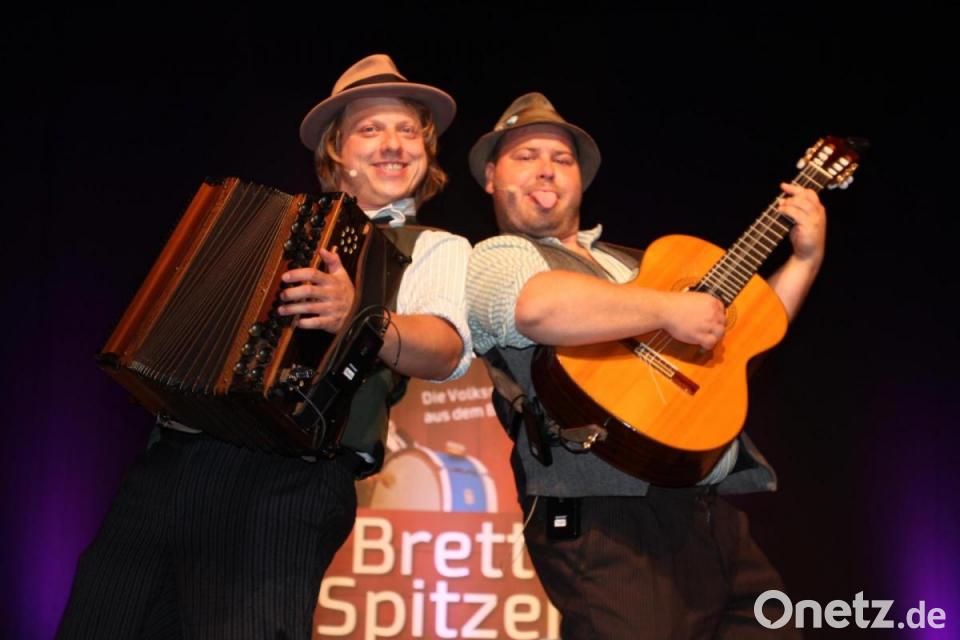 Publikumsliebling des Abends war wohl das Duo Tom und Basti aus dem niederbayerischen Mauth bei Passau, „die Antwort des 21. Jahrhunderts auf den Weiß Ferdl und den Roider Jackl“, wie es in ihrer Homepage heißt. Mit ihrer Musik begeisterten die beiden Komödianten aus dem Waldler-Land, ausgestattet mit einer Gitarre und einer Steierischen, das Tirschenreuther Publikum. Mit dem Lied „Was geht des uns a, des geht uns goa nix a“ sorgten sie sofort für eine ausgelassene Stimmung. Die Zuhörer im Kettelerhaus präsentierten sich wie ein Gemeinschaftschor und sangen fleißig mit, so auch beim Hit „Nur fünf Minuten später“. Nicht minder kaltschnäuzig war Barbara Preis aus Bodenmais, etwa mit dem Lied „Des is da Postfrosch“. Fast schon lasziv betonte sie, dass sie keinesfalls als Jungfrau sterben wolle.