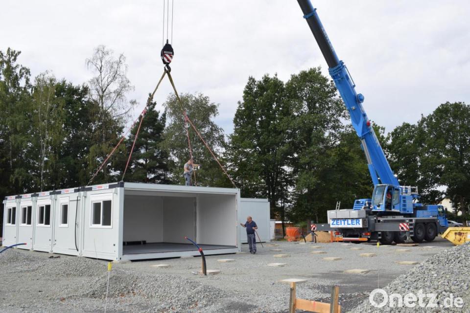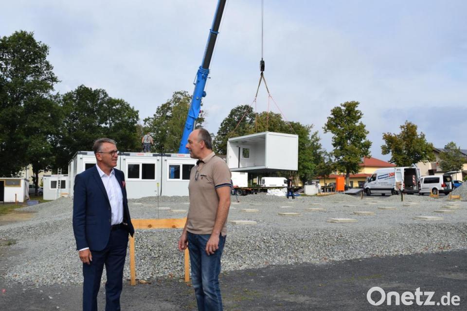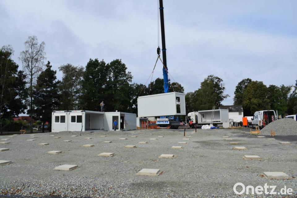 Zwei Wochen bereitete das Team um Lutz Zangl, Mitarbeiter des Stadtbauamts, das Volksfestplatz-Areal für den Interimskindergarten vor. Aus den insgesamt 44 Modulen entstehen zwei Gebäude-Blöcke mit sechs Metern Abstand dazwischen. Dies war aus brandschutztechnischen Gründen so zu machen, erklärt der Mitarbeiter des Stadtbauamts, der sich um die zwei BRK-Kindergartenbaustellen am Volksfestplatz und am Zob kümmert. Im ersten Container-Gebäude sind zwei Kindergarten-Gruppen untergebracht, im zweiten Block ziehen zwei Kinderkrippen-Gruppen ein. Insgesamt bieten die Container eine Fläche von 500 Quadratmetern. Zangl steckte viel Arbeit in die Planung - auch das Kindergarten-Personal war involviert und entschied etwa über die Anordnung der Container mit.