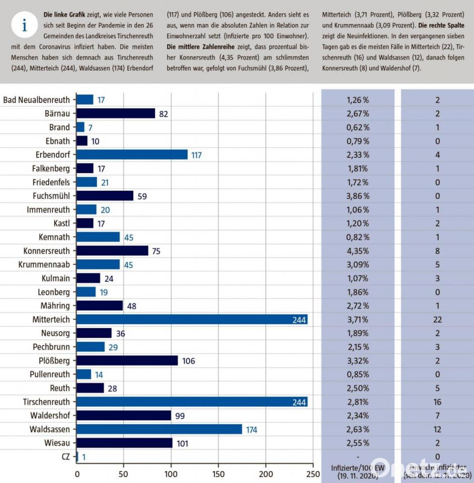 Seit vier Wochen veröffentlicht das Landratsamt auch jeden Donnerstag die Gesamtzahlen für die einzelnen Kommunen. Die meisten neuen Fälle wurden in den vergangenen sieben Tagen in Mitterteich (22), Tirschenreuth (16) und Waldsassen (12) verzeichnet. Auffällig ist, dass es seit einer Woche nur in 5 Kommunen keine Neuinfizierten gab. Wobei die Schwerpunkte momentan größtenteils im Stiftland liegen.