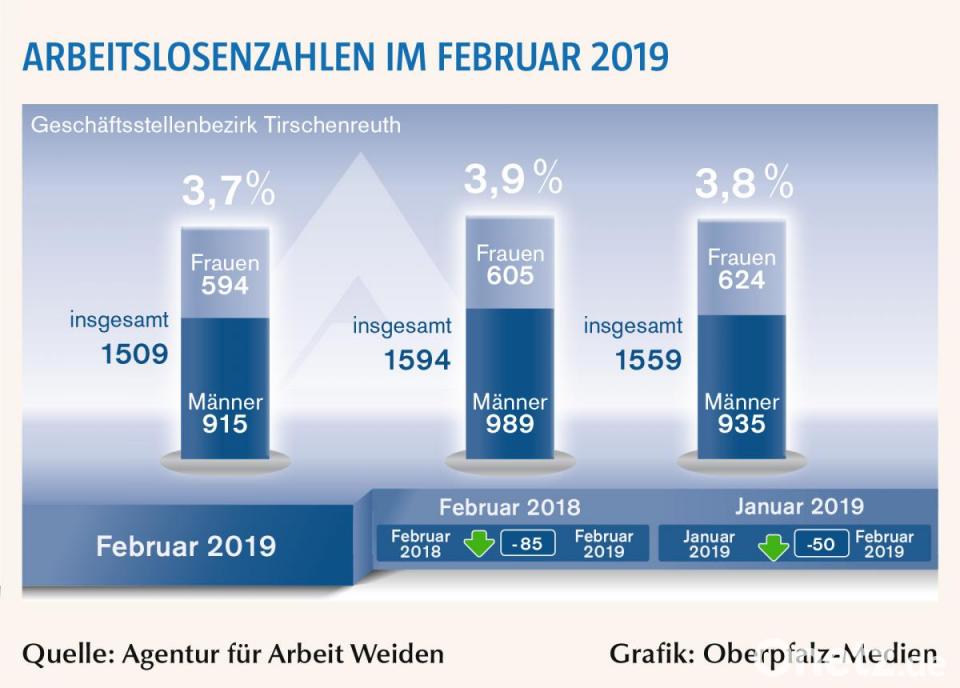 "Die gute Wirtschaftslage bedingt beste Beschäftigungschancen und spiegelt sich in den 978 gemeldeten Arbeitsstellen wider. Die Zahl der arbeitslosen Männer und Frauen sank im Februar auf 1509 und lag damit um 85 niedriger als im Vorjahr", freut sich Thomas Franz, Leiter der Agentur für Arbeit Tirschenreuth. "Binnen zehn Jahren sank die Arbeitslosigkeit im Landkreis von 2950 Personen auf aktuell 1509 Arbeitslose. Die momentane Auftragslage und der damit verbundene hohe Einstellungsbedarf der Betriebe sprechen auch in den nächsten Monaten für einen weiteren Abbau der Arbeitslosigkeit", urteilt Thomas Franz.