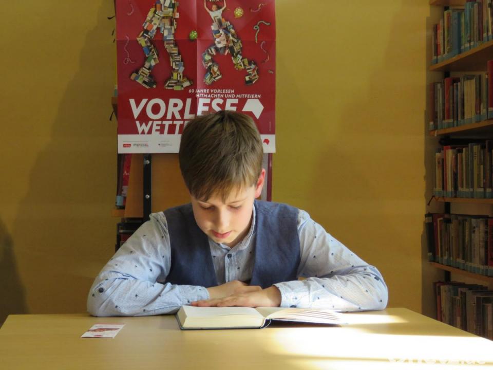 Der Sieger, Felix Schmidkonz aus der Waldsassener Realschule im Stiftland (Klasse 6 a), hatte sich mit dem Klassiker "Räuber Hotzenplotz" von Otfried Preußler im Vorfeld in seiner Schule durchgesetzt und kam zum Landkreiswettbewerb mit dem Buch "Die Bratwurstzipfeldetektive und das Geheimnis des Rollkoffers" von Jens Steiner. Felix blieb sowohl beim Vortrag aus seiner selbst gewählten Lektüre als auch beim Fremdtext aus dem französischen Kinderbuch "Tagebuch eines Möchtegern-Versagers" von Luc Blanvillain selbstsicher im Lesen und beim lebhaften Vortragen.
