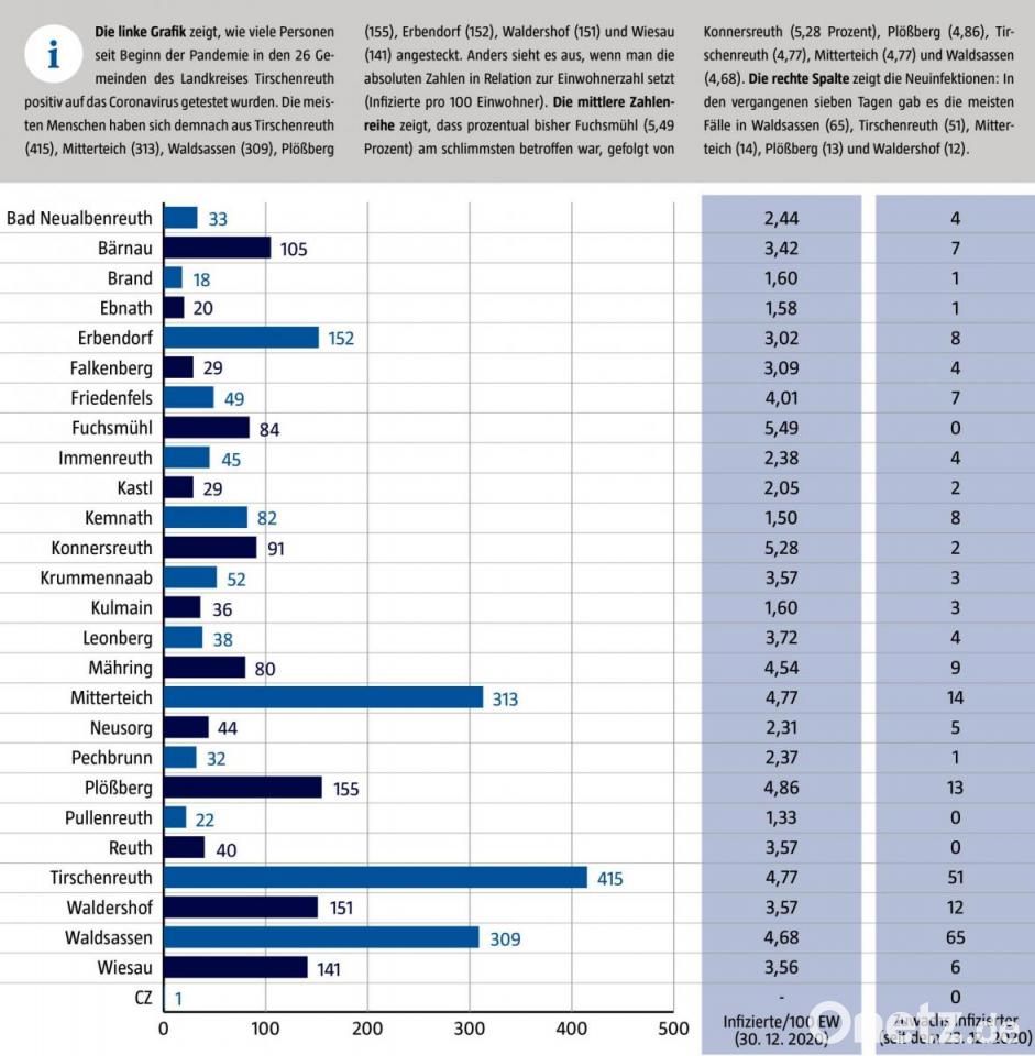 Das Landratsamt veröffentlichte am Mittwoch zudem die aufsummierten Zahlen der Covid-19-Infektionen in den 26 Gemeinden. Innerhalb der vergangenen sieben Tage wurden 234 Landkreisbürger positiv auf das Virus getestet: Die meisten Fälle gab es in Waldsassen (65) und Tirschenreuth (51). Dies ist auch auf die gemeldeten Ausbrüche in den zwei Altenheimen (St. Martin und Haus Ziegelanger) zurückzuführen. In der relativ kleinen Gemeinde Mähring gab es neun Neuinfizierte.