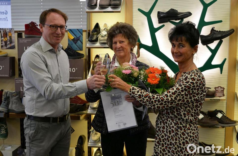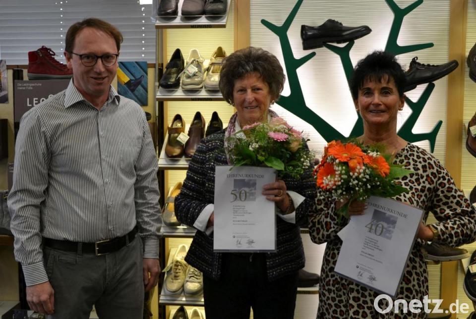 Andreas Wettinger verlieh beiden Frauen die goldene Handwerkskammer-Nadel. Da er dies bis zur letzten Sekunde geheim gehalten hatte, sorgte die Auszeichnung bei den Damen für große Augen. Rita Wettinger führte gemeinsam mit ihrem heuer verstorbenen Mann bis 2006 den im Jahre 1895 gegründeten Betrieb. Seither leitet ihr Sohn Andreas das Geschäft. Er erweiterte das Angebot des Schuhhauses um die Bereiche Orthopädie und Podologie. Stella Hirsch, die 40 Jahre in der Firma tätig ist, kümmert sich neben dem Verkauf und der Kompressionsversorgung auch um die neuen Geschäftsfelder. "Stella berät immer fleißig. Ich danke ihr für ihr freundliches, zuvorkommendes Wesen und ihre Loyalität", lobte Wettinger.