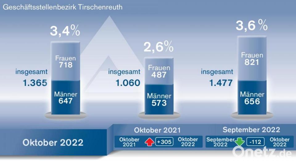 Weiterhin im Aufwind befindet sich der Arbeitsmarkt im Landkreis Tirschenreuth im Oktober. Mit einer Arbeitslosenquote von 3,4 Prozent ist eine weitere Verbesserung zum Vormonat um 0,2 Prozentpunkte erreicht worden. Im Vorjahresvergleich verschlechterte sich die Quote allerdings um 0,8 Prozentpunkte. Die Anzahl der Arbeitslosen stieg um 28,8 Prozent oder 305 Personen auf 1.365 arbeitslose Männer und Frauen.