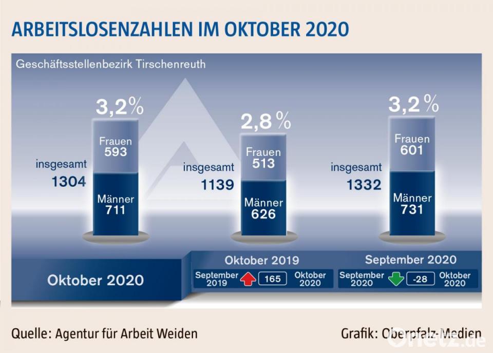 Als stabil kann man den Arbeitsmarkt im Landkreis Tirschenreuth im Oktober bezeichnen. Und das trotz der Coronakrise. Mit einer Arbeitslosenquote von 3,2 Prozent ist der gleiche Wert wie im Vormonat erreicht worden. Im Vorjahresvergleich verschlechterte sich die Quote um 0,4 Prozentpunkte und die Anzahl der Arbeitslosen stieg um 14,5 Prozent oder 165 Personen auf 1 304 Arbeitslose Männer und Frauen.