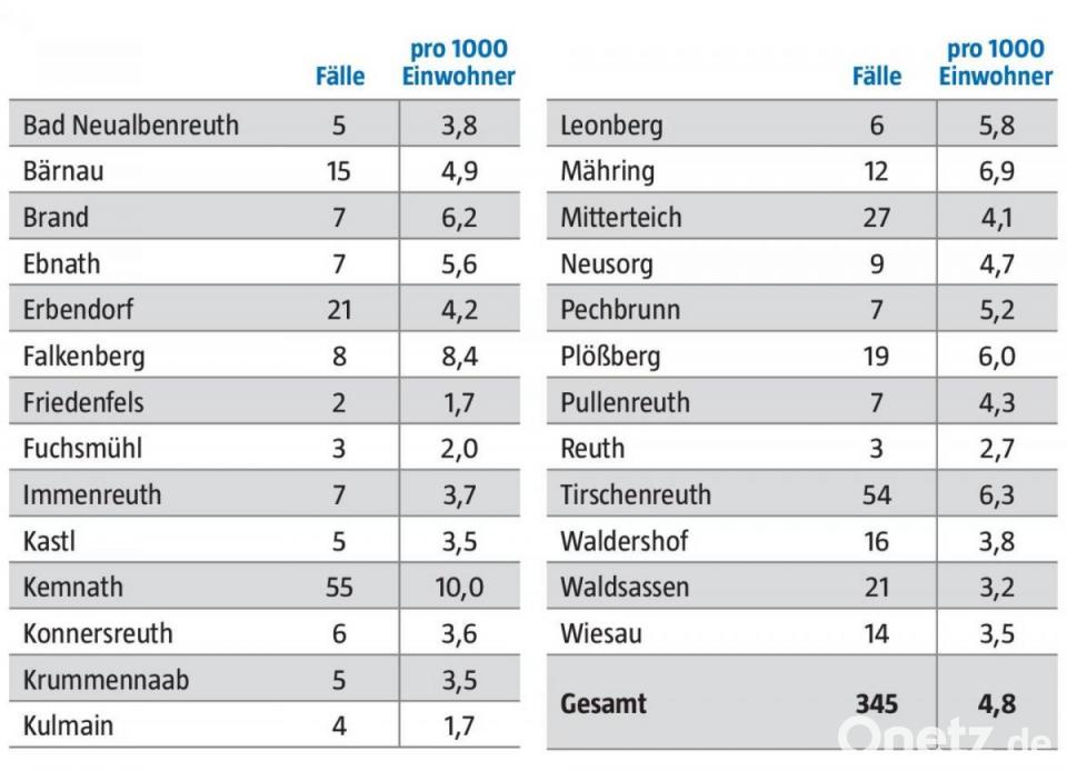 Mittlerweile gibt es wieder in allen Gemeinden des Landkreises Neuinfektionen. Die meisten wurden in den vergangenen sieben Tagen in Kemnath (55), Tirschenreuth (54) und Mitterteich (27) verzeichnet. Hochgerechnet auf die Gemeindegröße hatten Kemnath und Falkenberg die meisten Fälle. Die niedrigsten Inzidenzen wiesen Friedenfels, Kulmain und Fuchsmühl auf.