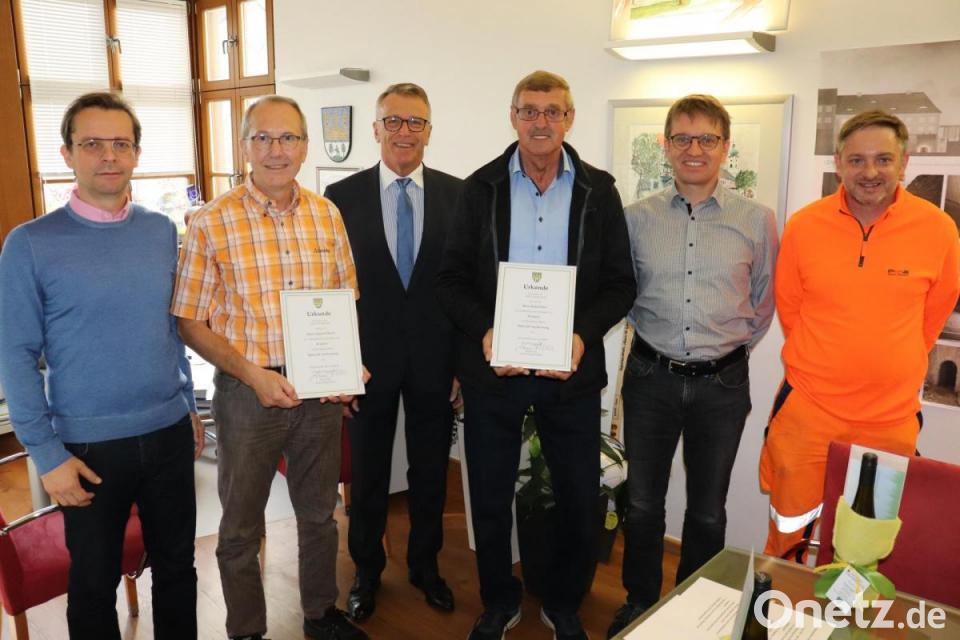 Beide sind seit 40 Jahren im öffentlichen Dienst: Rudolf Beer und Siegfried Meierl. Im Rahmen einer kleinen Feierstunde beglückwünschte Bürgermeister Franz Stahl die Jubilare und überreichte ihnen eine Urkunde, eine Flasche Bürgermeisterwein und einen Restaurant-Gutschein.