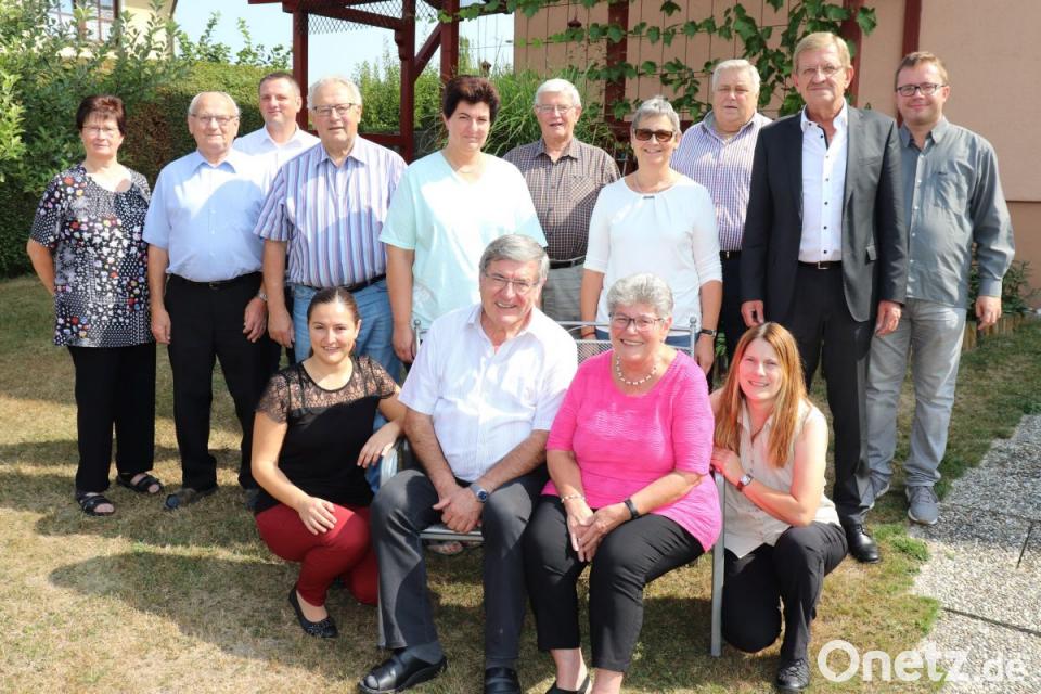 Günther und Edith Franz (sitzend) gratulieren die Töchter Birgit und Iris (vorne rechts und links) sowie (stehend von rechts) Kirchenchorleiter Wilhelm Heidtmann, dritter Bürgermeister Norbert Schuller, MGV-Vorsitzender Rudi Schmidt, Doris Mehler, MGV-Dirigent Horst Schultes, Brigitte Forster, Alfred Haubner, Elisabethenverein-Geschäftsführer Rainer Schmid, Karl und Cilly Konrad.