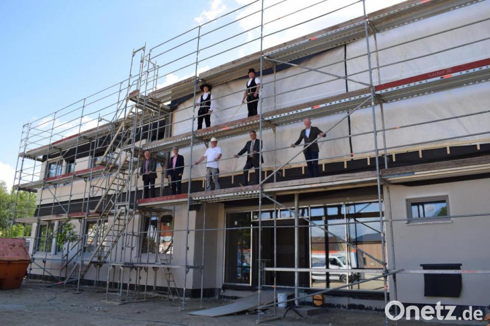 Die Reden anlässlich der Fertigstellung des Hausbaus übernahmen Günther Meyer von der Fertigbaufirma Regnauer und Zimmermann André Hertel von der Firma Holzbau Seitzer. Nach dem Richtspruch führte Kewog-Geschäftsführer Bernd Büsching die neugierigen Gäste durch das Bürogebäude.