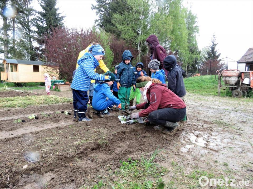 Von den Erzieherinnen und den Fachfrauen angeleitet, arbeiten die Kinder mit eifrigem Ernst, sind wissbegierig und neugierig bei der Sache. Am ersten Tag werden Kohlrabi, Kartoffeln, Zucchini, Rote Bete und Zuckermais gepflanzt. "Alles altbewährte, robuste Sorten", erklärt Monika Zeitler. Im Juli wird nachgepflanzt. Der erste Pflanztag ist gleichzeitig eine Schlammschlacht. Doch die Kinder haben ihren Spaß auch im Regen. Sie stampfen fröhlich durch den Schlamm, bald von oben bis unten damit bedeckt.