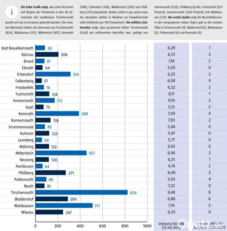 Im April erfolgten bisher 22.279 Tests an den Testzentren/Teststationen. Die neben den Testzentren Tirschenreuth und Waldsassen regulären Stationen in Kemnath und Erbendorf würden mit 100 bis 200 Tests pro Tag gut angenommen. Eine Testpflicht besteht weiterhin für die tschechischen Grenzpendler: Von 2922 Schnelltest in den vergangen sieben Tagen waren 2 positiv.