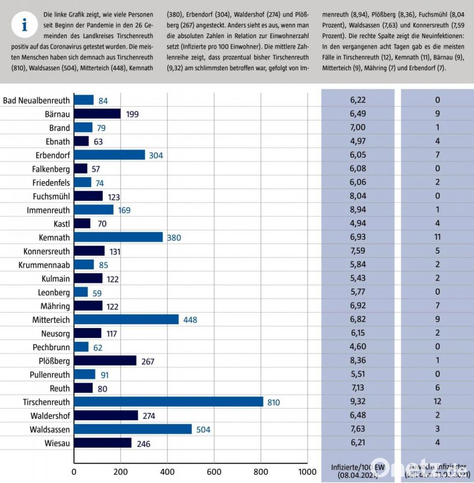 Positiv nimmt das Gesundheitsamt zur Kenntnis, dass die Zahl der Neuinfektionen weiter sinkt. Außer in Familien gebe es keine Schwerpunkte. Beim Blick auf die veröffentlichen Corona-Zahlen auf Gemeindeebene wird allerdings deutlich, dass es in den vergangenen acht Tagen nur in sechs Kommunen keine neuen Fälle gab. Besonders betroffen waren in Relation zur Einwohnerzahl Mähring (6) und Reuth (6).