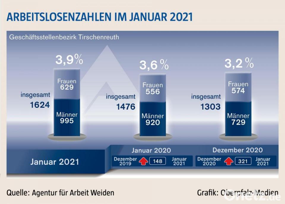 995 Männer und 629 Frauen waren im Agenturbezirk Tirschenreuth arbeitslos. Steigende Arbeitslosenzahlen im Januar verzeichnete die Arbeitsagentur insbesondere bei den Männern mit einem Plus von 266 zum Vormonat. Aufgrund dieser saisonal bedingten Zugänge ergibt sich im Januar im Landkreis Tirschenreuth eine zum Vorjahr um 0,3 Prozentpunkte höhere Arbeitslosenquote.
