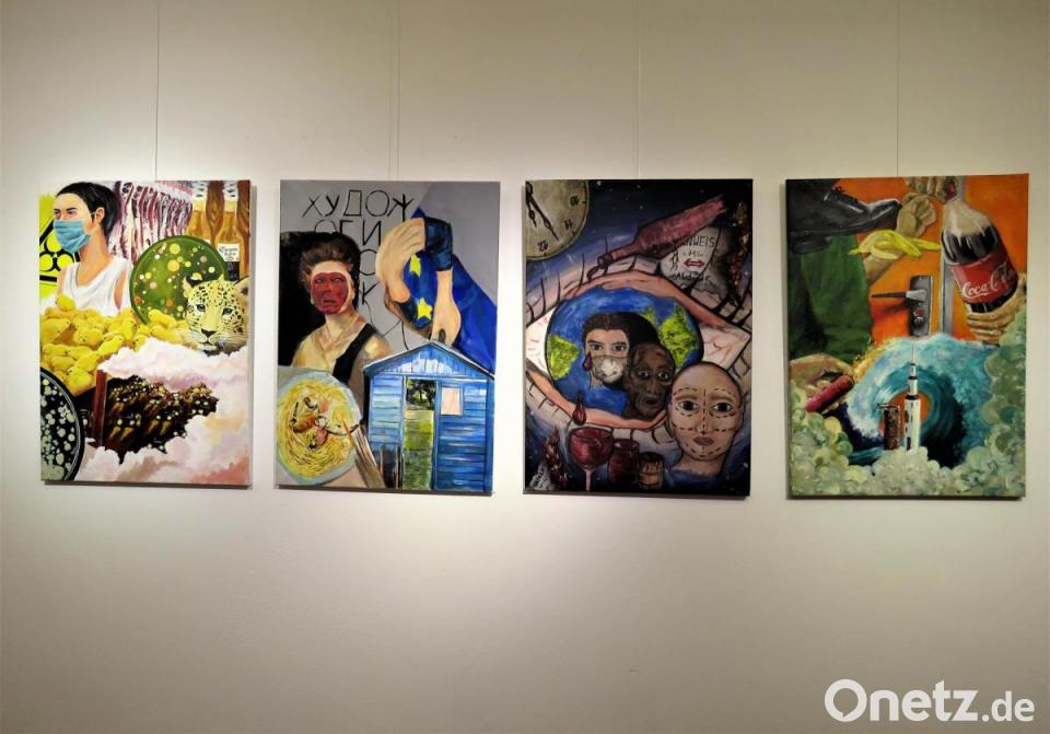 Franz Stahl eröffnete die Ausstellung mit Blumen für die Gäste, unter anderem für die beiden Musikerinnen Hannah Plößner an der Gitarre und Christine Licha mit Gesang. Die sehenswerte Ausstellung zeigt großflächige Kollagen, mit sich ständig wiederholenden Motiven in Verbindung der Pandemie. Die Schülerinnen haben sich viele Gedanken gemacht. Unter anderem stellen sie "Repeat" nahezu auf allen Arbeiten mit einer Uhr dar. Banale Dinge wie ein Türdrücker, ein Stiefel, eine Coca Cola oder ein Glas aus dem roter Wein (oder Blut?) tropft, werden Gegenstand von Kunst. Nahezu immer tragen die abgebildeten Menschen Stoffmasken im Gesicht. Mimik und Gesten sind verzerrt vor Entsetzen, Unverständnis und dem Leid, das Corona auslöst, dargestellt. Die Ausstellung kann im Museumsquartier während der normalen Öffnungszeiten besichtigt werden.