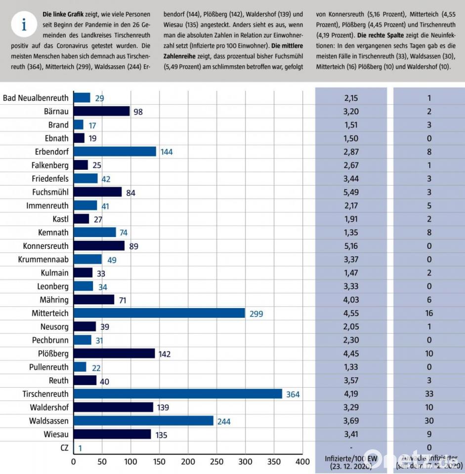 Das Landratsamt veröffentlichte am Mittwoch zudem die aufsummierten Zahlen der Covid-19-Infektionen in den 26 Gemeinden. Innerhalb der vergangenen sechs Tage wurden 156 Landkreisbürger positiv auf das Virus getestet: Die meisten Fälle gab es in Tirschenreuth (33) und Waldsassen (30). Dort gab es in zwei Alten- und Pflegeheimen Ausbrüche (wir berichteten). Auch bei den aufsummierten Zahlen seit dem Ausbruch der Pandemie zeigt sich, dass besonders viele Fälle in Orten mit solchen Einrichtungen verzeichnet wurden.