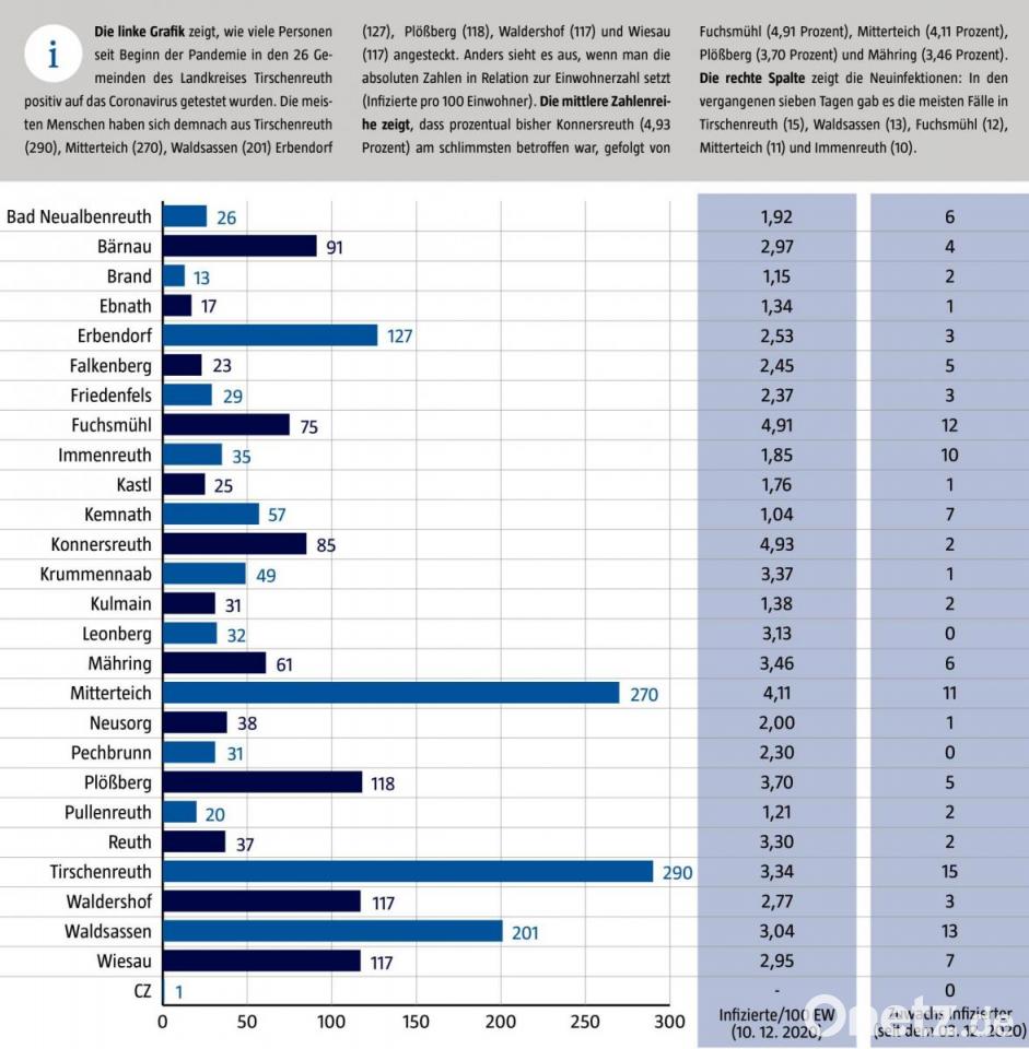 Das Landratsamt veröffentlichte am Donnerstag die wöchentlich aufsummierten Zahlen der Covid-19-Infektionen der 26 Gemeinden. Weiterhin ist auffällig, dass es in fast allen Kommunen Neuinfektionen gab. Ausnahmen waren in den vergangenen sieben Tagen Pechbrunn und Leonberg. Die Werte aus den relativ kleinen Gemeinden Fuchsmühl (12) und Immenreuth (10) stechen diesmal negativ heraus. Bei der Bewertung der Zahlen ist zu beachten, dass die Statistik nur die beim Gesundheitsamt eingegangenen positiven Testergebnisse berücksichtigt. Die Zahl Null bietet keine Sicherheit vor Ansteckung.