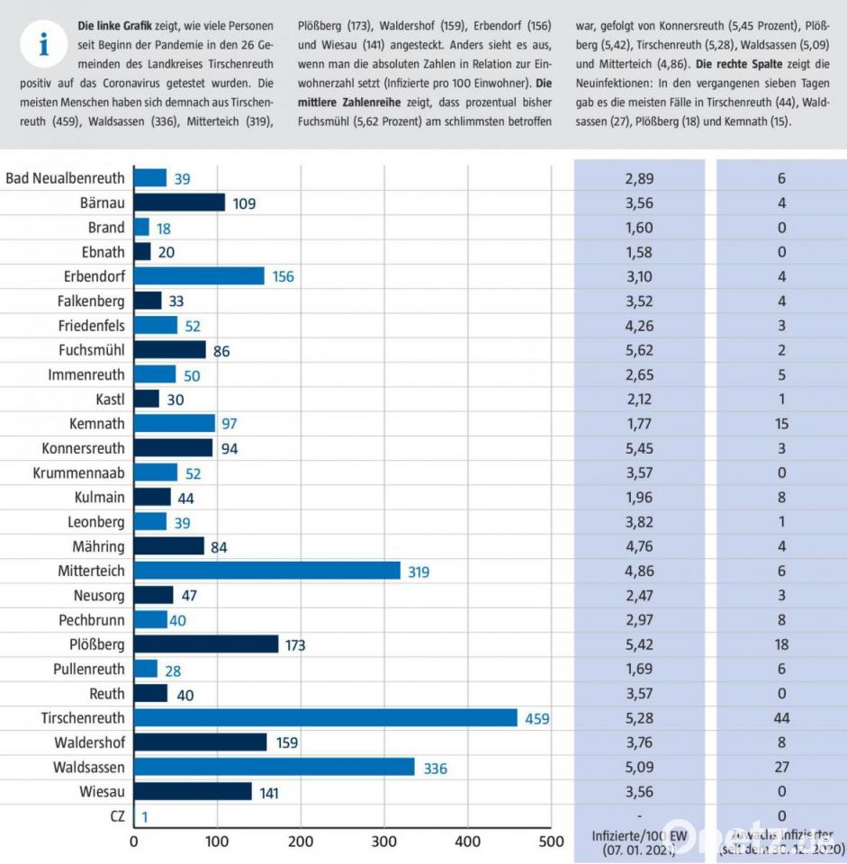 Doch warum gerade in diesen beiden Orten die Infektionszahlen so hoch sind, macht auch das Gesundheitsamt ratlos. "Es ist immer noch ein diffuses Infektionsgeschehen", betont Fenzl. Auch der westliche Landkreis ist mit Kemnath (15) und Kulmain (8) diese Woche stärker betroffen. In Relation zur Einwohnerzahl gab es außerdem in Plößberg viele Fälle (18).