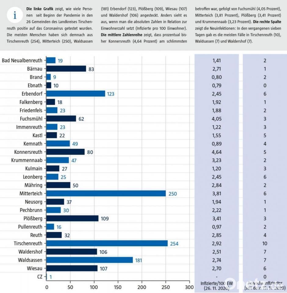 Aufgrund jeweils eines positiven Falls befinden sich die „Krippengruppe“ und die „Spatzengruppe“ der Kindertagesstätte Bad Neualbenreuth bis einschließlich Montag, 7. Dezember, unter Quarantäne. Ebenfalls musste wegen eines positiven Falls die Krippengruppe „Blaue Strolche“ des Kinderhauses Li-La-Löhle Kemnath bis einschließlich Freitag, 4. Dezember, in Quarantäne.