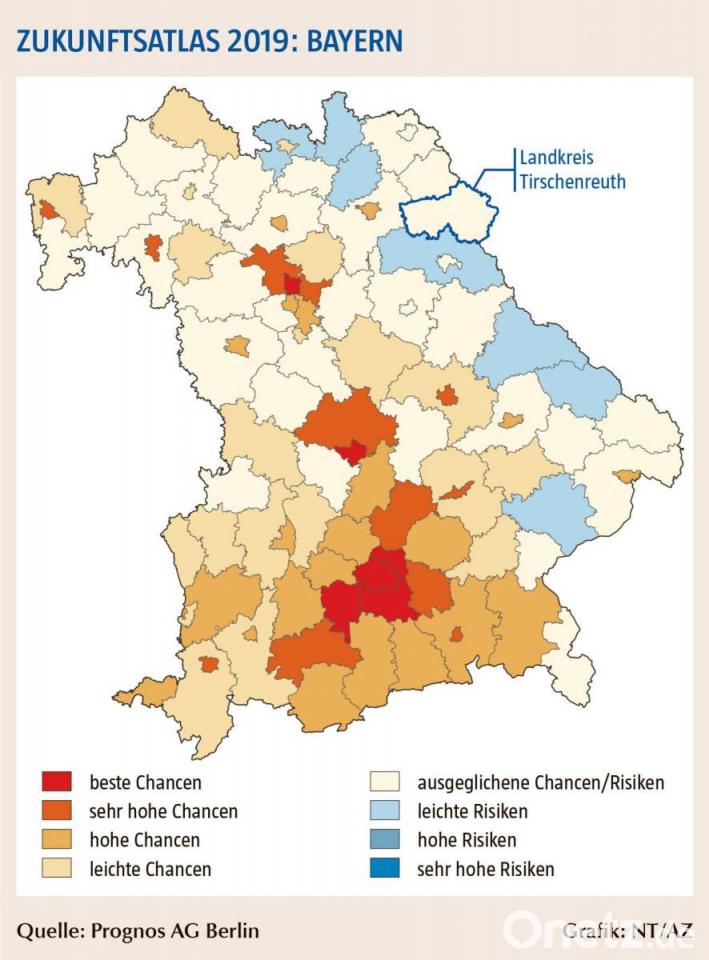 Für das Handelsblatt untersucht Prognos seit 2004 alle drei Jahre die Zukunftschancen und -risiken aller Kreise und kreisfreien Städte in Deutschland. Noch nie hat der Landkreis so gut abgeschnitten wie diesmal. Tirschenreuth hat nach den Ergebnissen des neuen Zukunftsatlas’ eine fulminante Aufholjagd gestartet. Prognos hat ermittelt, dass der dünn besiedelte Landkreis Tirschenreuth unter den 401 Kreisen und kreisfreien Städten Deutschlands eine der zehn Aufsteigerregionen ist.