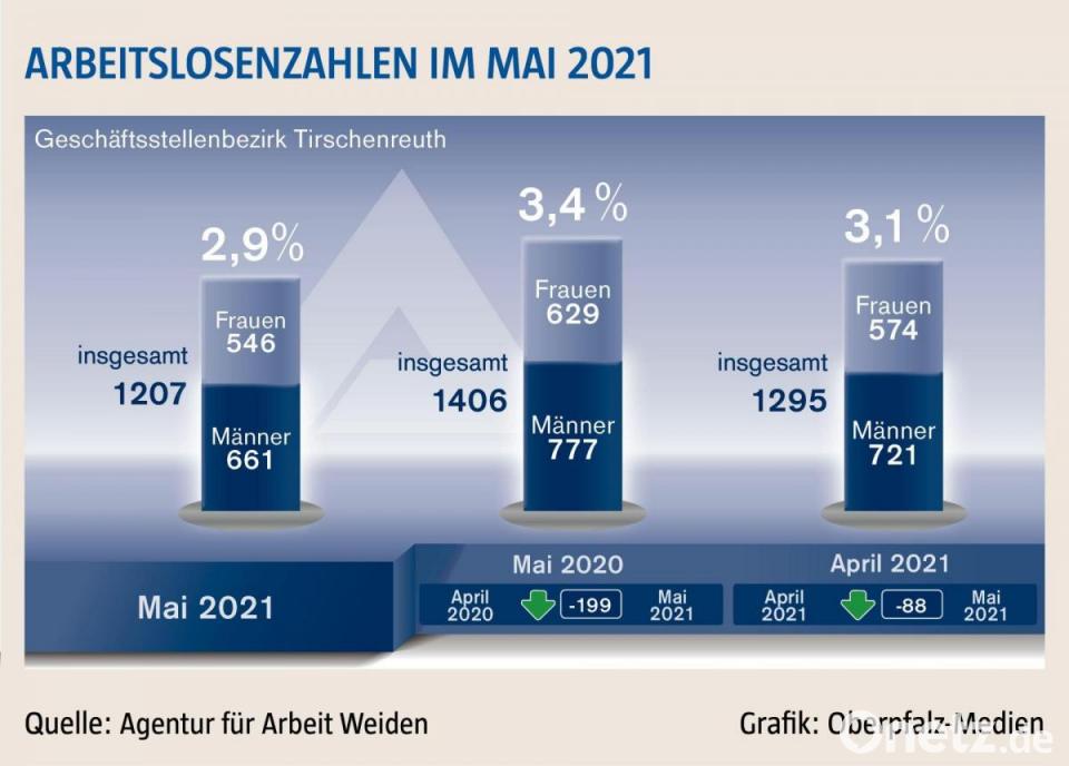 Die Zahl der arbeitslosen Menschen im Landkreis Tirschenreuth sank im Mai 2021 weiter. So waren 1.207 Männer und Frauen von Arbeitslosigkeit betroffen, die Arbeitslosenquote sank auf 2,9 Prozent. Im Vergleich mit den Vorjahreswerten entspricht das einem Absinken um 14,2 Prozent oder 199 arbeitslos gemeldeten Menschen. „Hierbei gilt es zu beachten, dass zwei Berichtsmonate innerhalb der Krise miteinander verglichen werden: Mai 2020 und 2021", wird Thomas Franz, Leiter der Agentur für Arbeit Tirschenreuth, in einer Mitteilung zitiert.