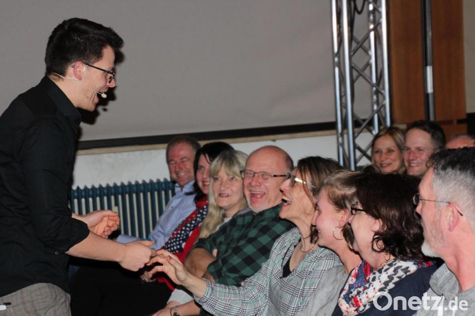Am Ende des Abends überreichte Martin Frank ein Buchgeschenk an Zuschauerin Margot, die er immer wieder in sein Programm mit eingebunden hatte.