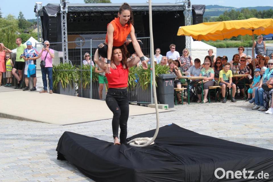 Die Performance des Duos Yoka und Aïssatou spielte sich an einem Tau ab. Sie trug den Namen "Katúk" und auch sie feierte an diesem Nachmittag Premiere. Aïssatou, die aus Barcelona stammt, wurde sogar von ihrer Familie in Tirschenreuth besucht. "Es war eine echte Überraschung, als sie auf einmal in unserem Esszimmer standen", freute sich Anna Zant über den Besuch. Aïssatou´s Familie kam Freitagnacht im Stiftland an - um den Auftritt ihrer Tochter am nächsten Tag persönlich miterleben zu können, erzählte die Tirschenreutherin bei der Anmoderation. Beide Akrobatinnen seien nicht nur Künstler-Kolleginnen, sondern auch gute Freundinnen von ihr, verriet sie. Yoka habe sie 2015 in Berlin kennen gelernt, nachdem sie von London in die Hauptstadt gezogen war.