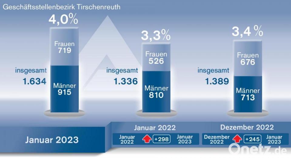 Insgesamt 915 Männer und 719 Frauen waren im Agenturbezirk Tirschenreuth arbeitslos. Steigende Arbeitslosenzahlen im Januar verzeichnete die Arbeitsagentur laut Mitteilung insbesondere bei den Männern mit einem Plus von 202 zum Vormonat. "Aufgrund dieser saisonal bedingten Zugänge" ergibt sich im Januar im Landkreis Tirschenreuth eine zum Vorjahr um 0,7 Prozentpunkte steigende Arbeitslosenquote.