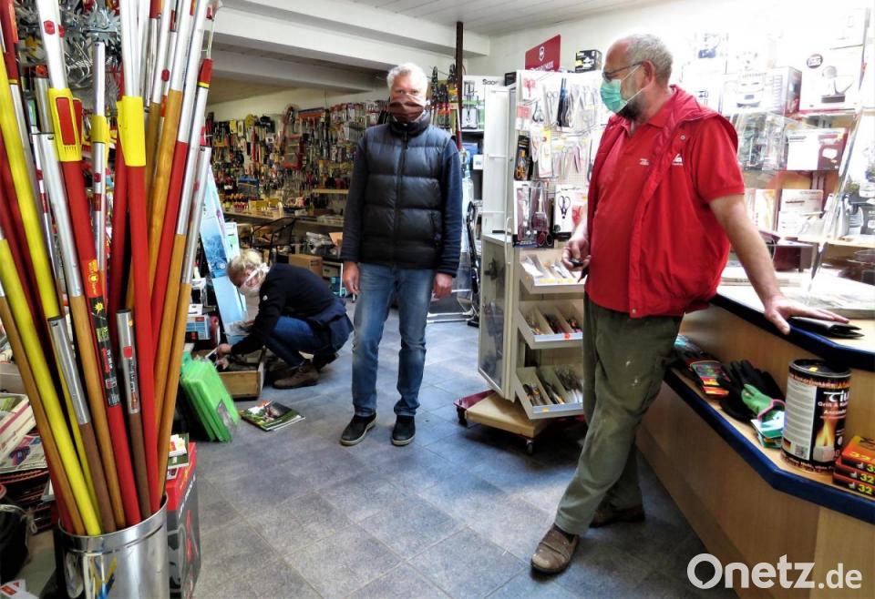 Auch bei Eisen-Bayreuther standen die Kunden um 8 Uhr an. „Da ist einiges daheim kaputtgegangen. Die Leute holen Ersatzteile“, erklärt Stefan Bayreuther. „Oder Kartoffelschäler“, fügt er an. Er hat seinen Laden umgeräumt wegen der Abstandsregelung. Franz Hackl kauft gerade ein, mit Mund-Nasen-Maske, versteht sich. Die Gespräche, die man gern wieder mit Stammkunden führt, drehen sich um Corona und die Gesichtsbedeckung.